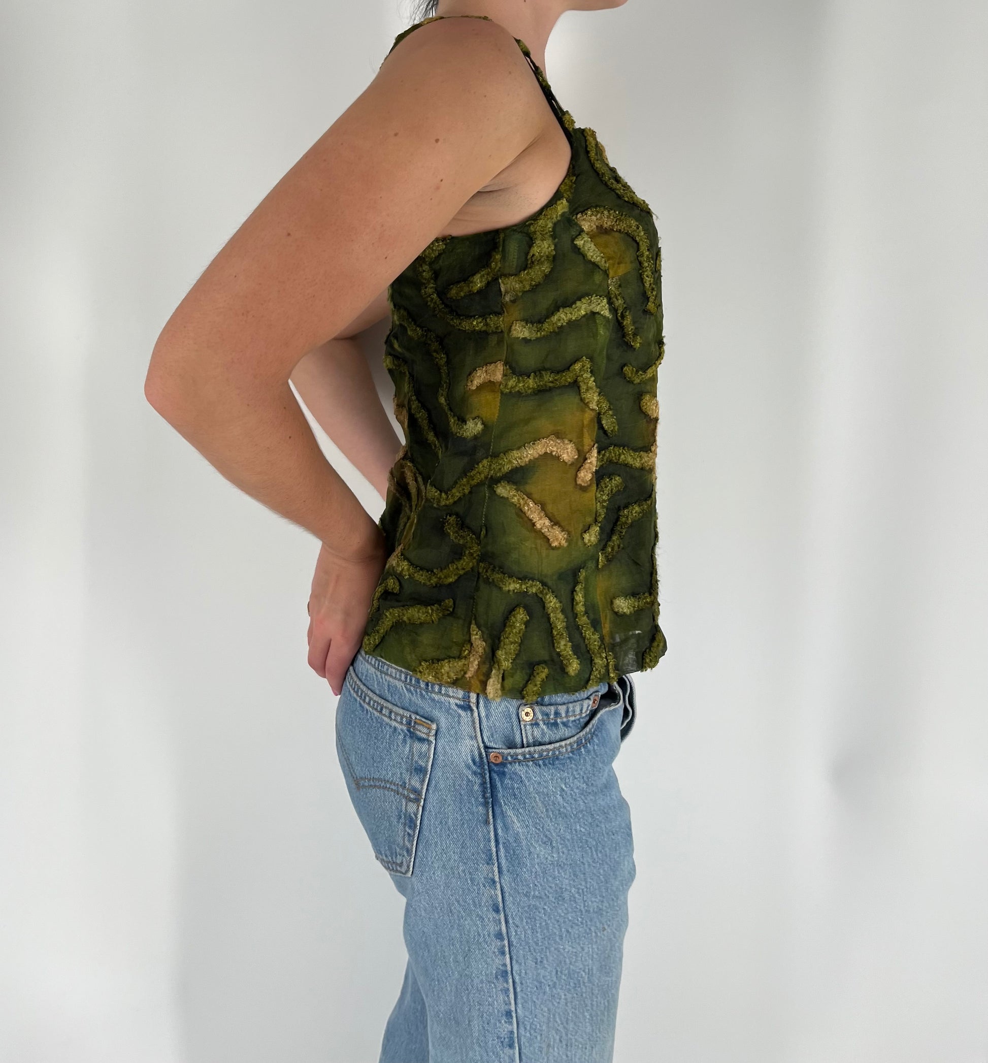 Unique swirls create an eye-catching design, while the spaghetti straps offer a flattering and feminine touch. The textured fabric adds dimension and interest to this versatile piece. Elevate your wardrobe with this stylish and distinctive tank. Best suited for someone between a size small and medium