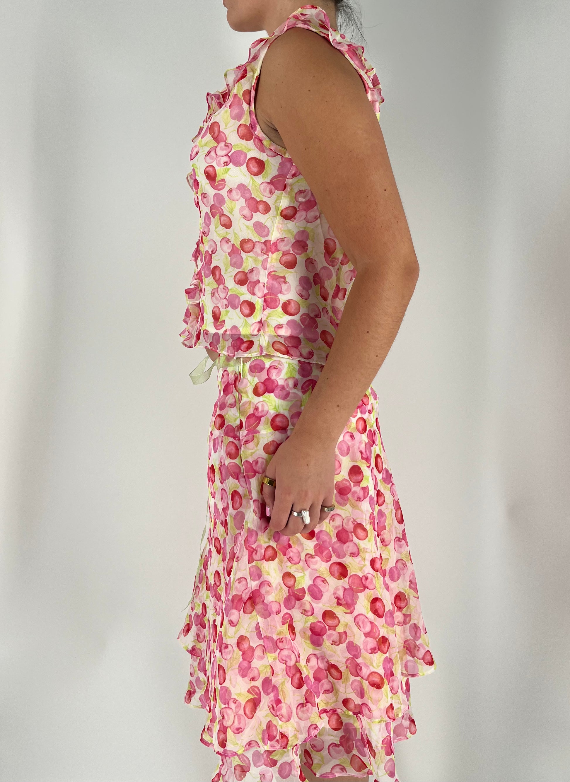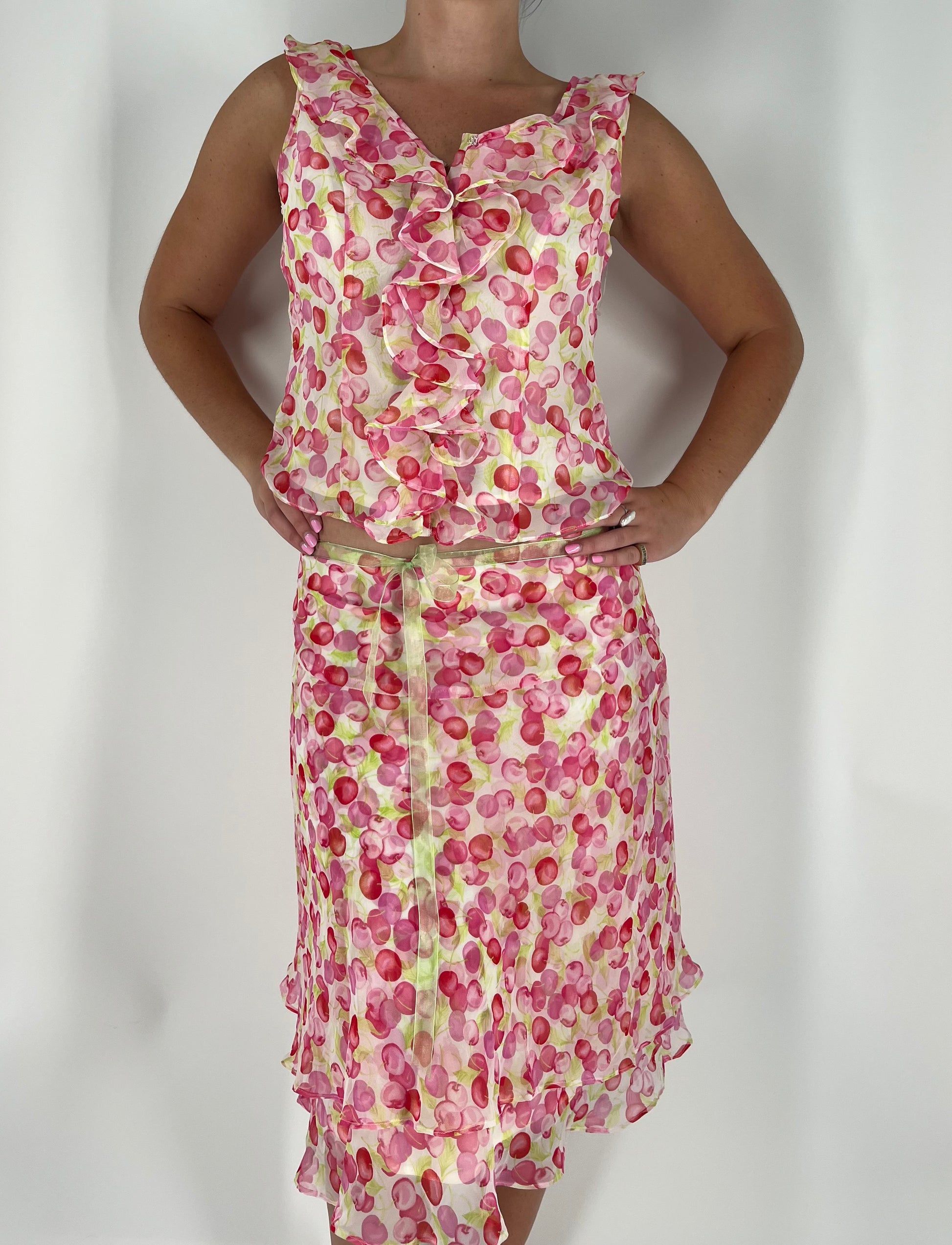 Add a splash of fun to your outfit with the Cherry Print 2-Piece Ruffle Skirt Set! Bursting with cheerful cherry patterns and flirty ruffles, this duo brings sweet charm and twirl-worthy style to any day. Best suited for someone in between a size small and medium. Skirt comes with a ribbon to adjust the waist.
