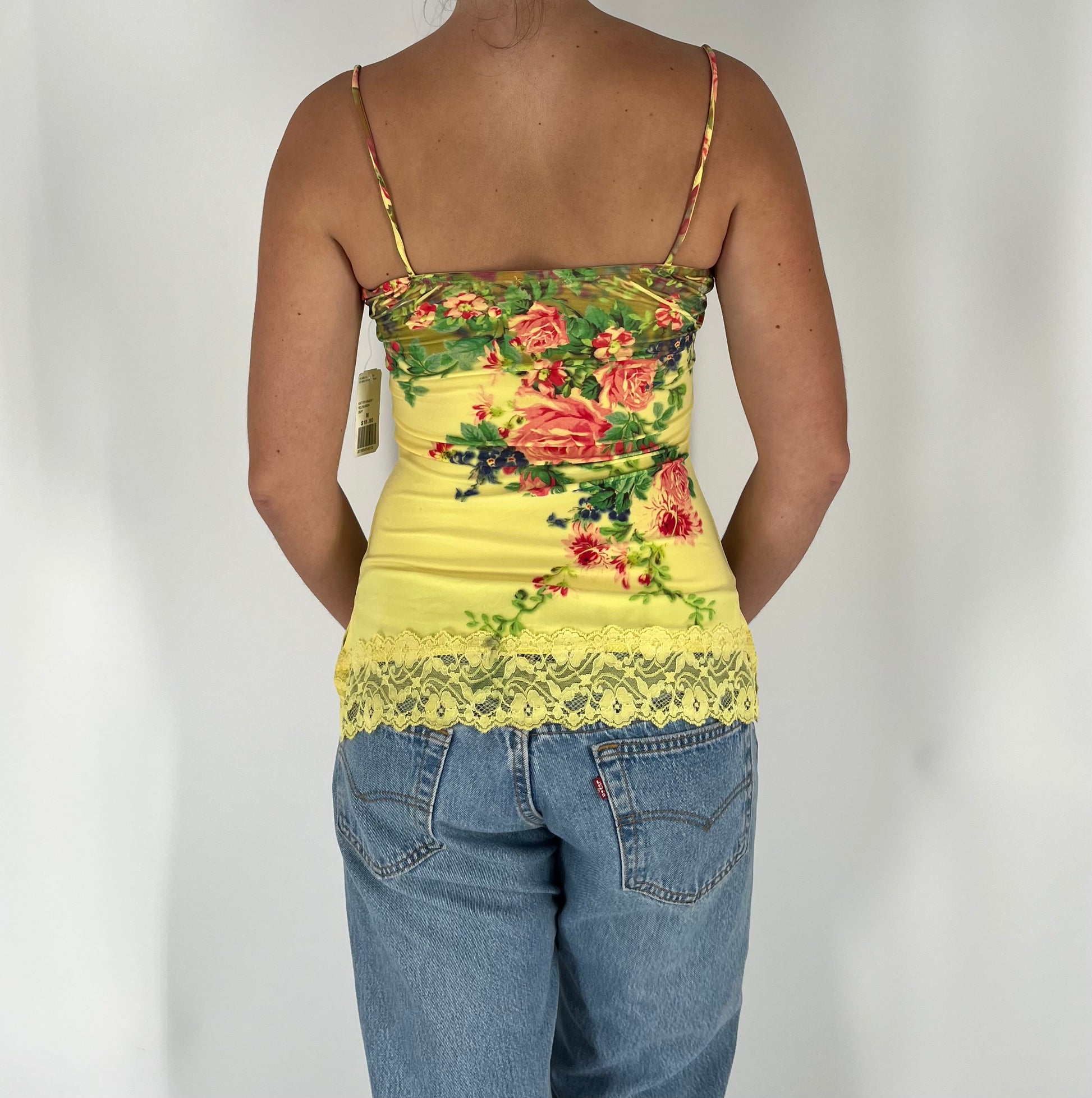 This tank's delicate floral lace adds a touch of vintage romance, perfect for sunny days. Light and airy, it keeps you cool while bringing playful elegance to any outfit. A nostalgic find ready to refresh your wardrobe with effortless style. Best suited for a size small but stretches to a size medium also