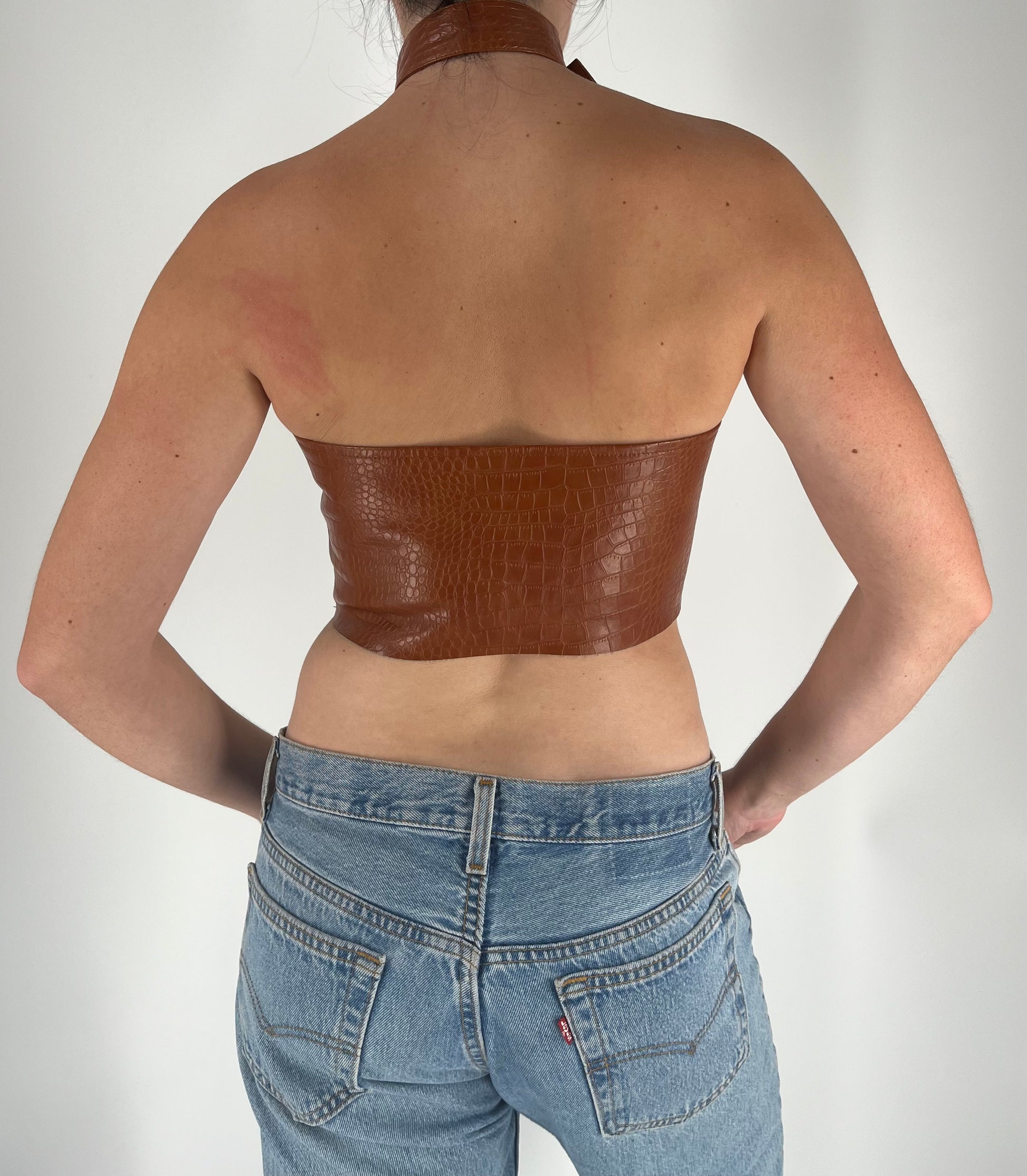 Step up your fashion game with this unique halter crop top! Featuring a trendy belt neck and lace up detail, this top will surely turn heads. Perfect for a night out, this top will make you feel one of a kind. This piece is not vintage - it’s modern fashion. Best suited for a size small
