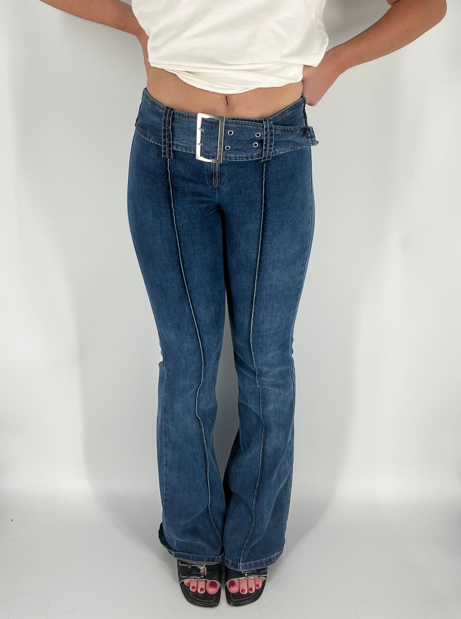 Time to bring on the flare with our Y2K-style jeans featuring an oversized square belt and flare leg. Get ready to slay your outfits with this unique and trendy pair, perfect for adding a touch of nostalgia to your wardrobe. Please note that these are not vintage - they’re modern fashion in vintage style. Best suited for a size 4
