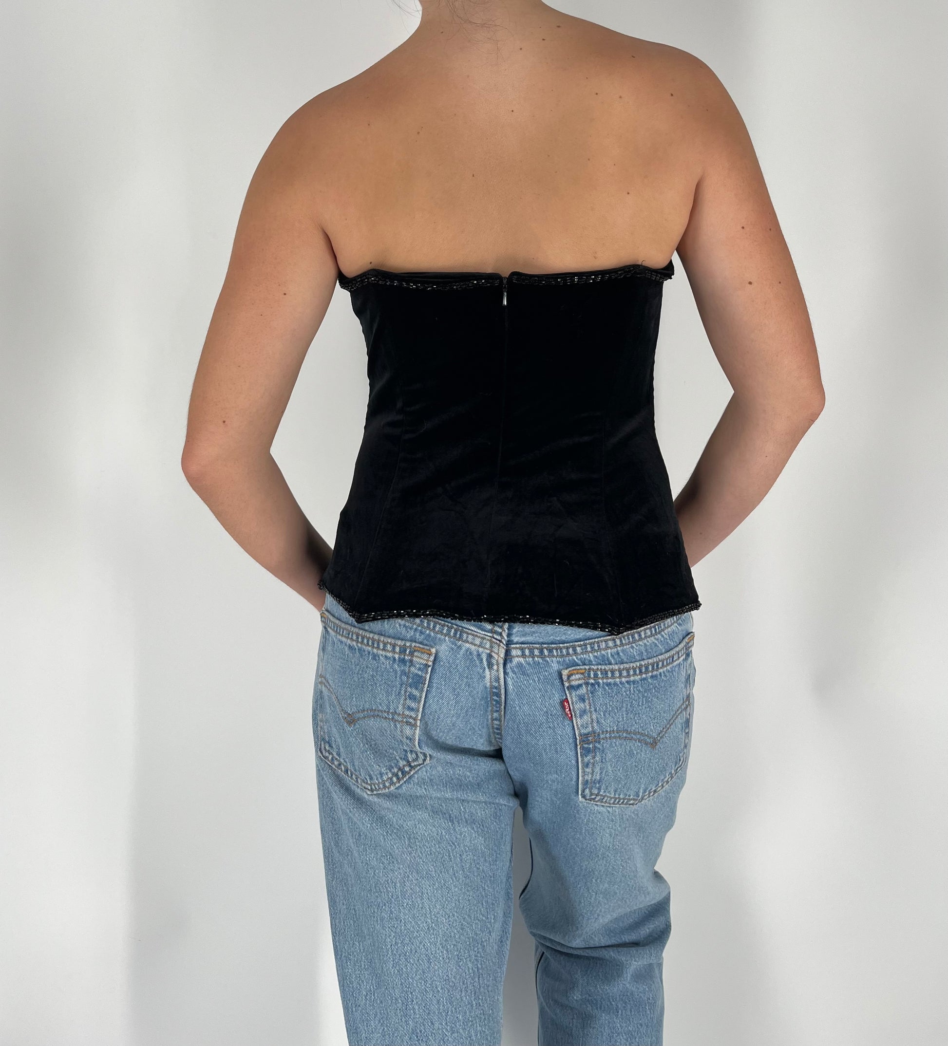 Add a luxurious touch to your evening look with our Velvet Beaded Strapless Corset Top. The soft velvet fabric and elegant beaded trim will make you stand out in any event. Go strapless for a bold statement, or accessorize with a stylish belt for a more playful look. Best suited for someone between a size small and medium