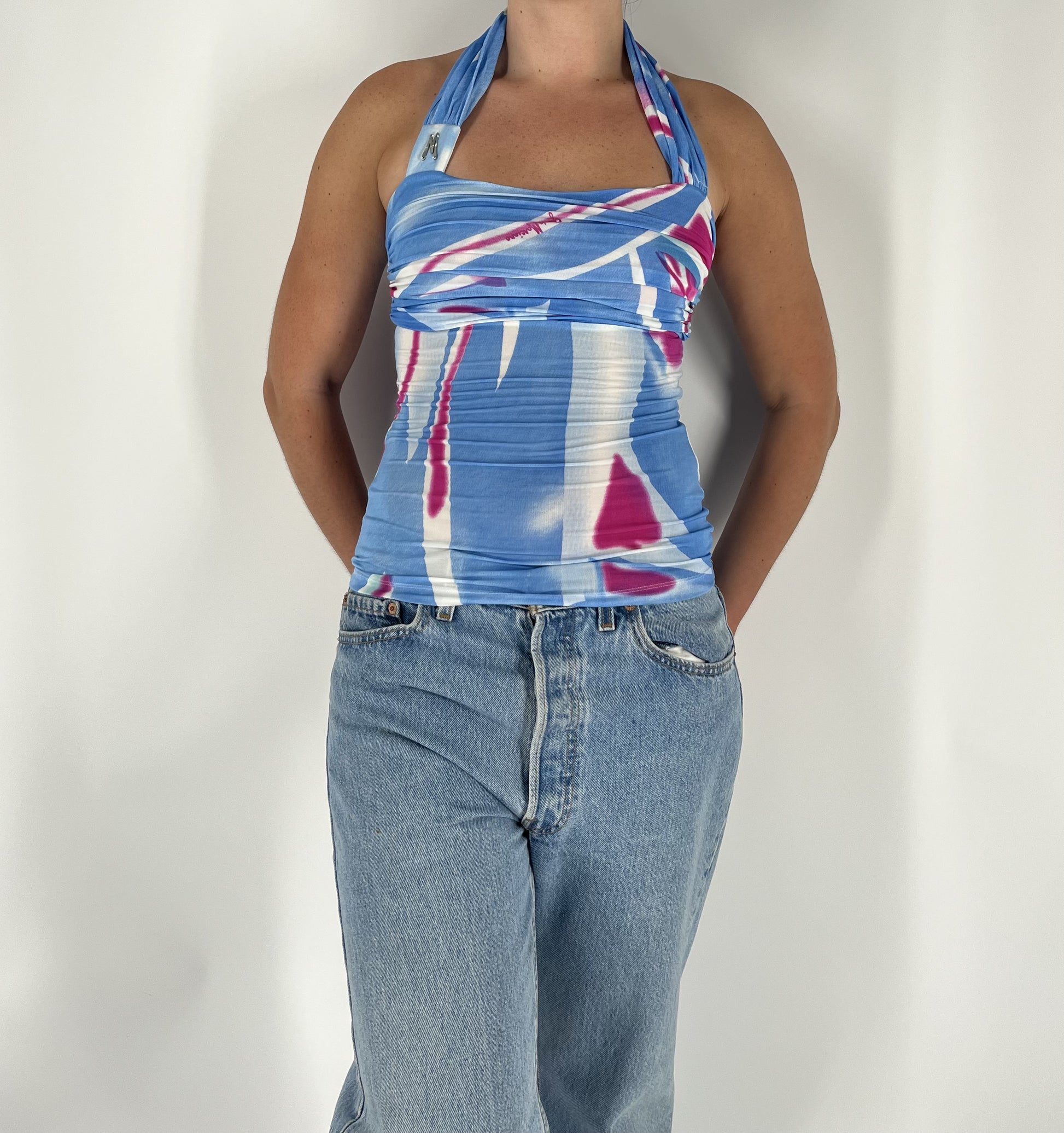 This vintage Y2K halter top features a bold abstract print in blue, white, and magenta with a flattering draped neckline. The stretchy micro-mesh fabric and fitted silhouette make it a playful yet chic statement piece, perfect for channeling true early 2000s fashion vibes. Style it with denim for a casual day look or elevate it with a skirt for night-out energy. A must-have for collectors of rare Y2K vintage. Suitable for size XS - M.