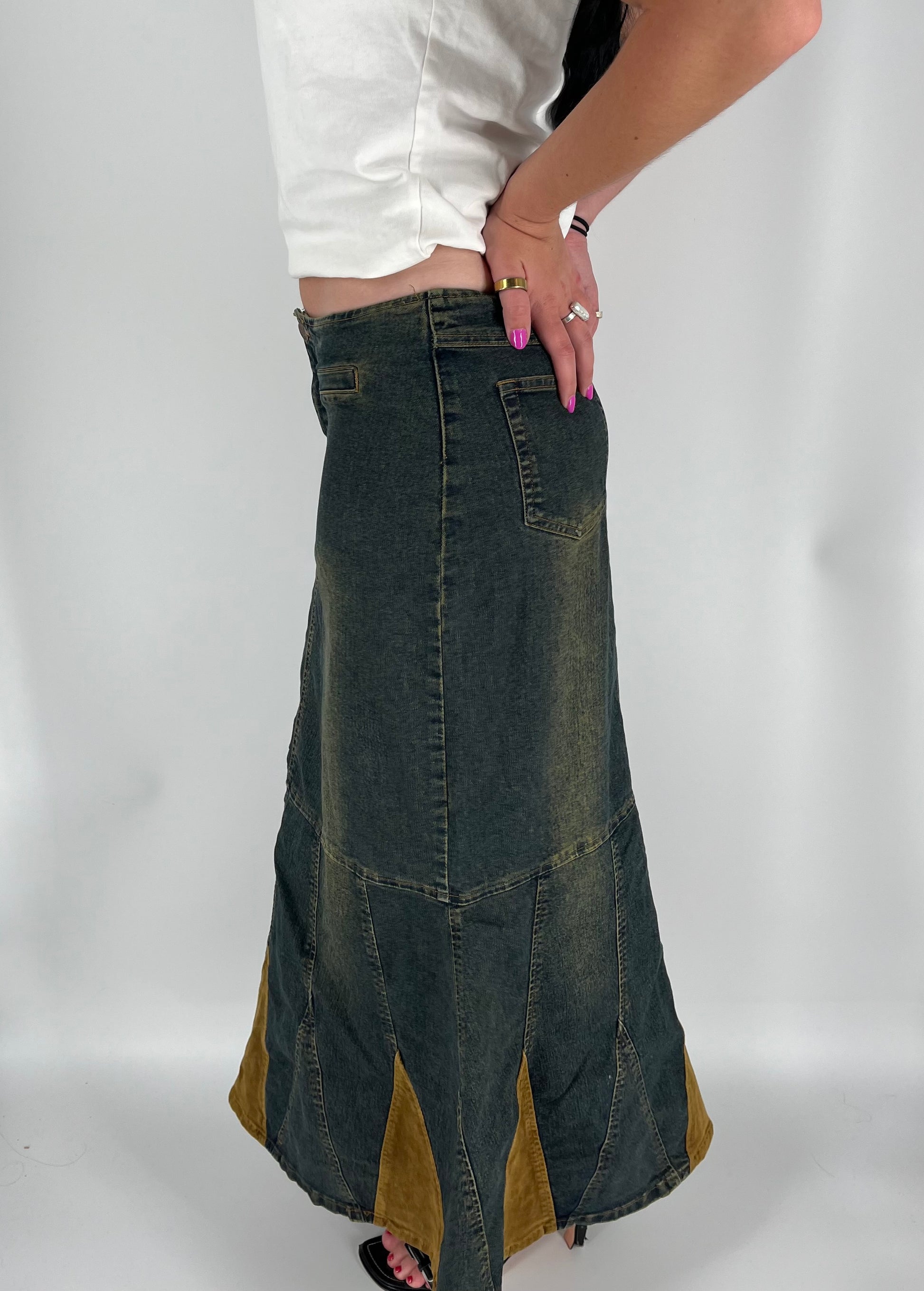 Y2K Fall Denim Maxi Skirt With Fading and Corduroy Accents