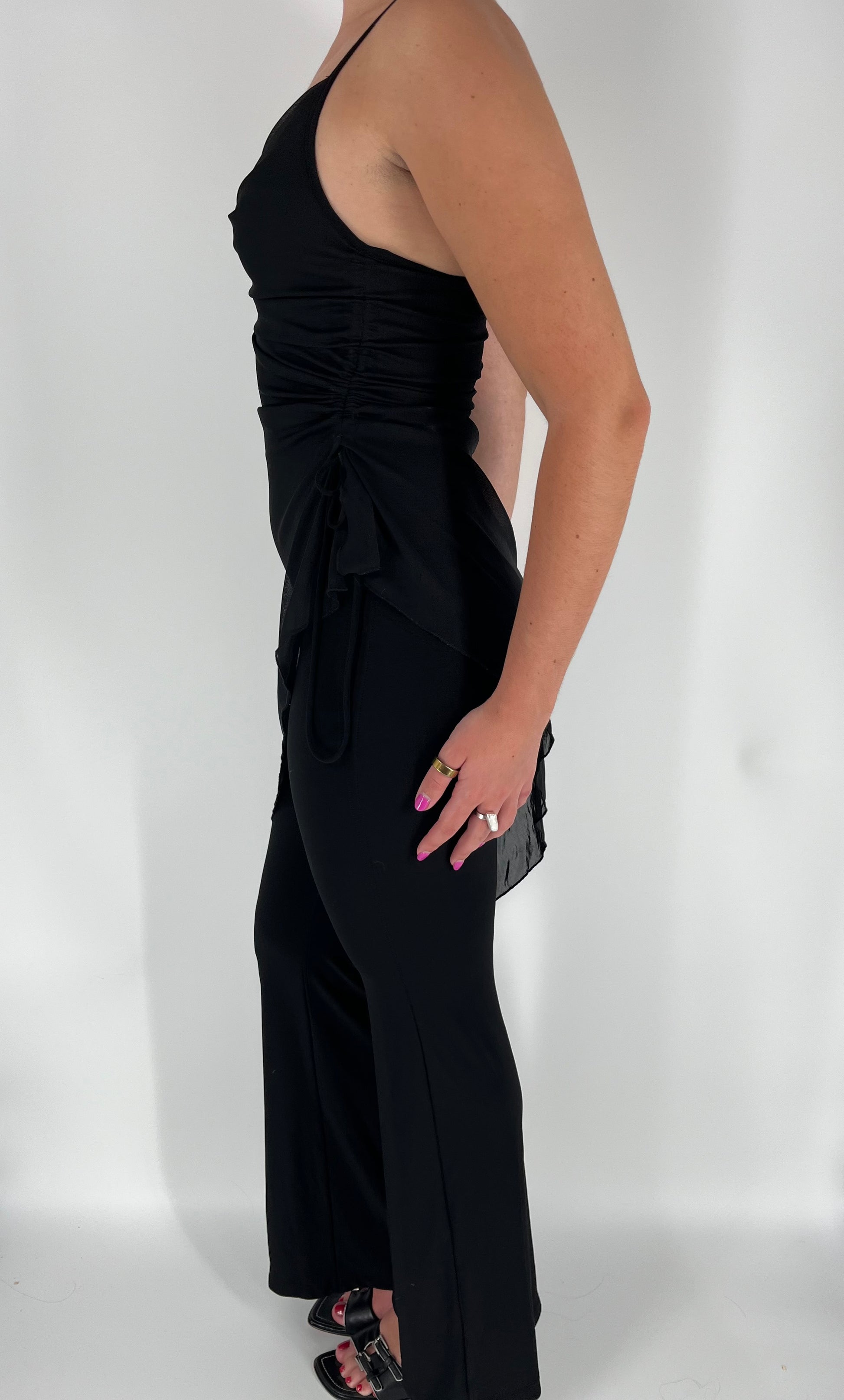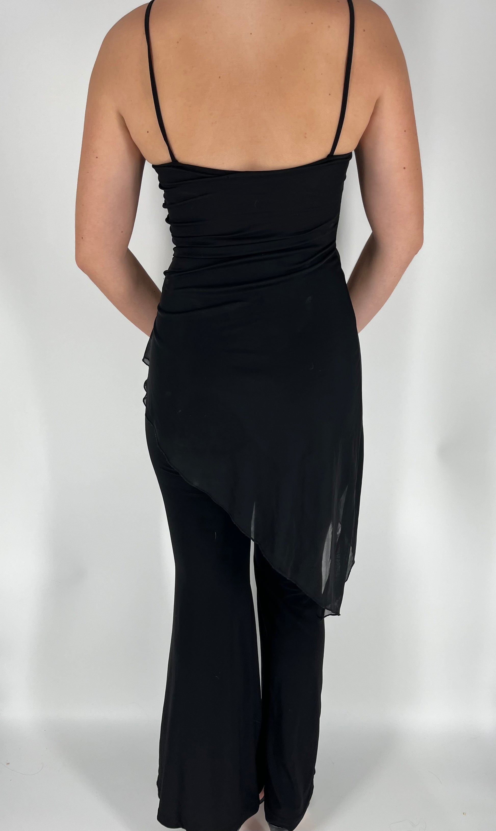 Featuring an asymmetrical mesh overlay, this jumpsuit will bring out your inner 90s diva. Perfect for parties or a night out, this jumpsuit is a must-have for any fashion-forward individual. Best suited for a size small